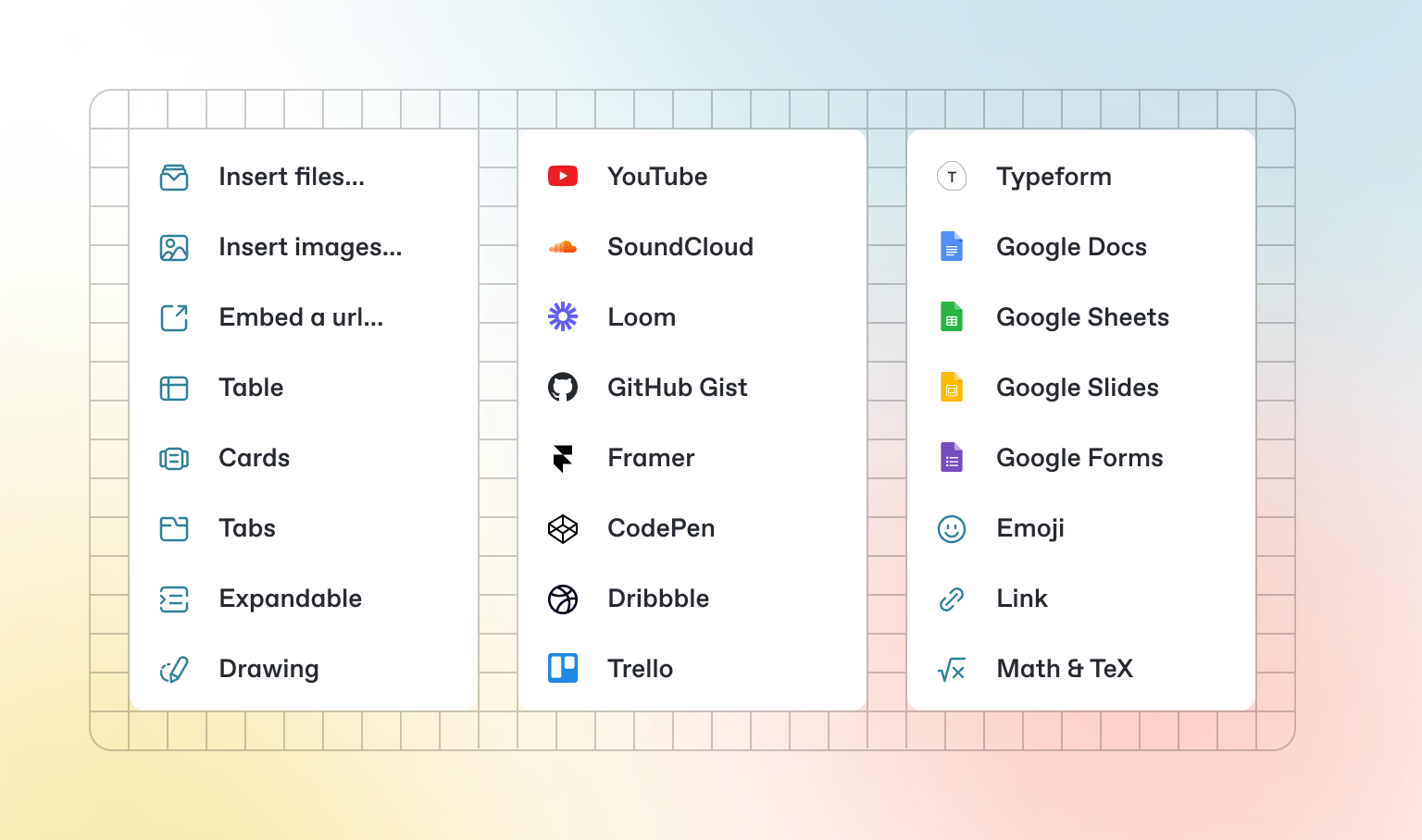 GitBook supports thousands of embedded websites out-of-the-box, simply by pasting their links. Feel free to check out which ones are supported natively.